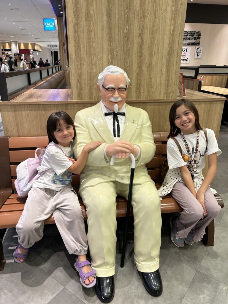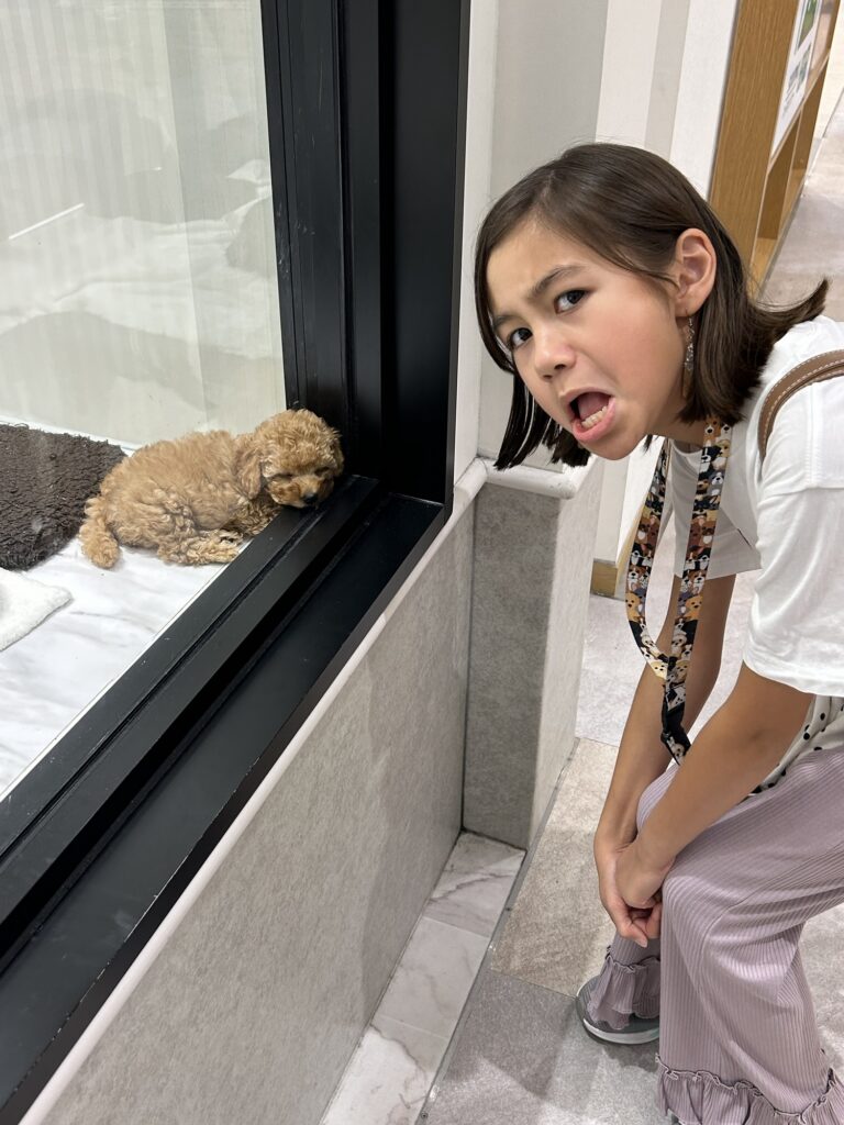 When we announced our defeat and pulled Joe away from the rest of the ice cream before he burst, we had only a few steps to walk from Costco to the outlet mall, where we browsed all sorts of fun and cute stores, and Maylin got a second pair of pants. The girls found an old friend on the lower floor!