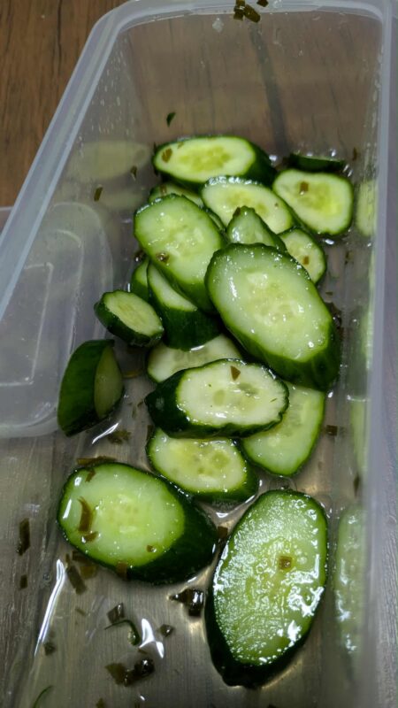 So today we chopped up 4 cucumbers and sprinkled the magic powder over top. Mix and set aside for minimum 30 minutes, preferably overnight. The result is a crunchy, salty, sweet, juicy and slightly seaweedy snack, I can totally eat a lot of these, and I did for dinner tonight! Now I also get why North American recipies that contain cucumbers say to carve out the mostly water middle, because I think our cucumbers would be too soggy in this marinade. It’s incredible the amount of juice that is being drawn out just by adding this sugar salt mixture!