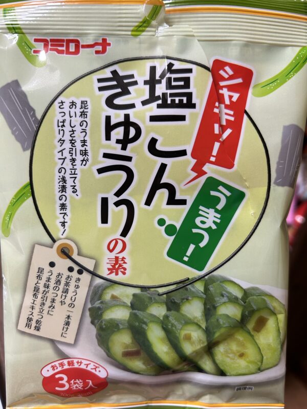 So this next product caught my eyes a couple of weeks ago, it’s a powder for making marinated cucumbers! I bought it and we tried it last week, finding it too strong with one pouch for two cucumbers (cucumbers here are smaller and crunchier than the ones I’m used to from both Canada and Norway). I bought some extra cucumbers today, so we could try it again, with a higher cucumber to powder ratio.