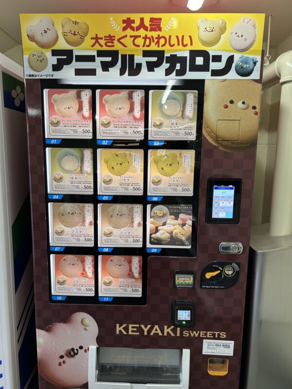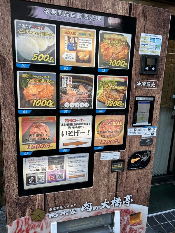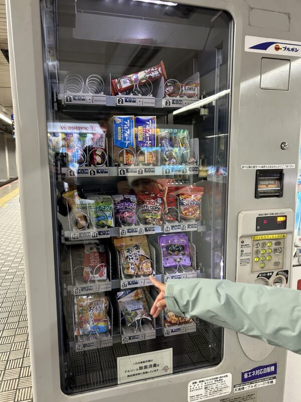 I napped the entire 40 minute train ride this time, making it feel like magic. The doors just closed in Kyoto, and now we’re back in Osaka! We got off the long train at a station that was new to us, and when rushing towards the next platform, Téa spots a vending machine worthy of a picture: