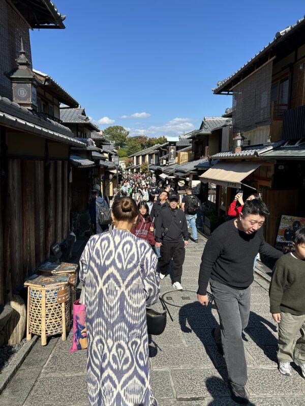 The Gion district of Kyoto is kind of like yesterday’s housing museum, lots of older, traditional style houses, in beautiful hills close to the mountains surrounding the city. It is absolutely packed in all directions, and lots of people rent kimonos for the day. There are male and female versions, long, short, wear your own sneakers or rent the toe socks and wooden sandals to go with it. Hair and makeup is a must for the ladies, and everywhere we go, we see tourists (and maybe locals?) dressed to the absolute nines.