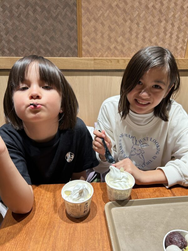 We have had such a beautiful day, full on sunshine, highs of 20-21. We started out in two layers and jackets on top, and by now we were walking around in t-shirts, looking for shade as the sun is still too warm for what we are wearing. We end up walking on the shaded side of the street, and now we are on the hunt for a snack. We walk and walk and walk for what seemed like an eternity, and finally ducked into a matcha place. The girls have their milk soft serve, Joe and I share a matcha red bean parfait, and we drink a beautifully refreshing cold matcha.
