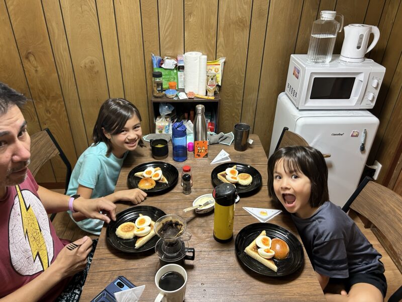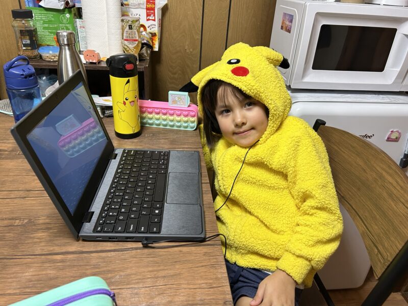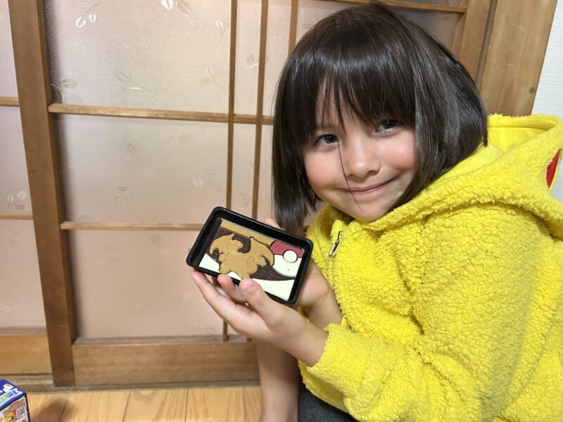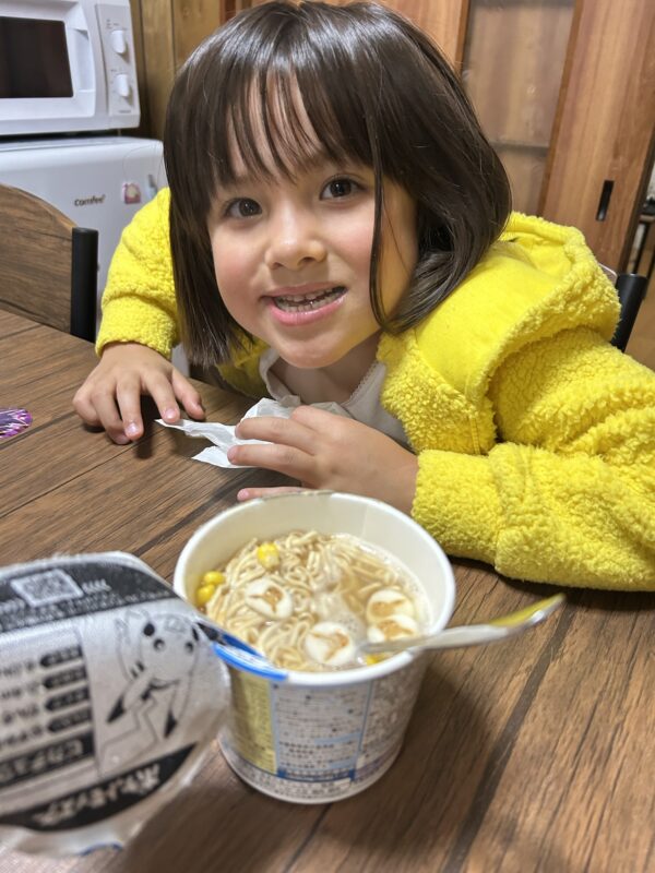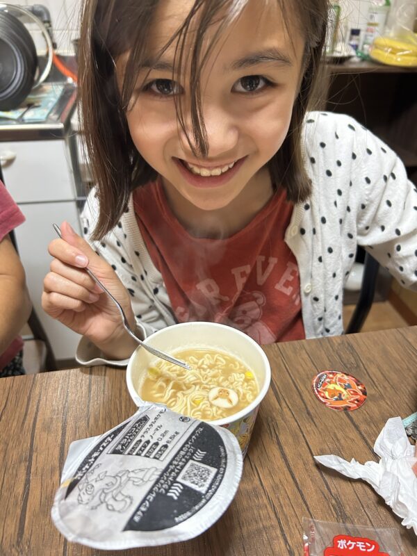 The girls and I had picked up some half sized Pokémon themed cup noodles when we went shopping the other day, so they were excited to see Eevee’s face staring up at them from their noodles.