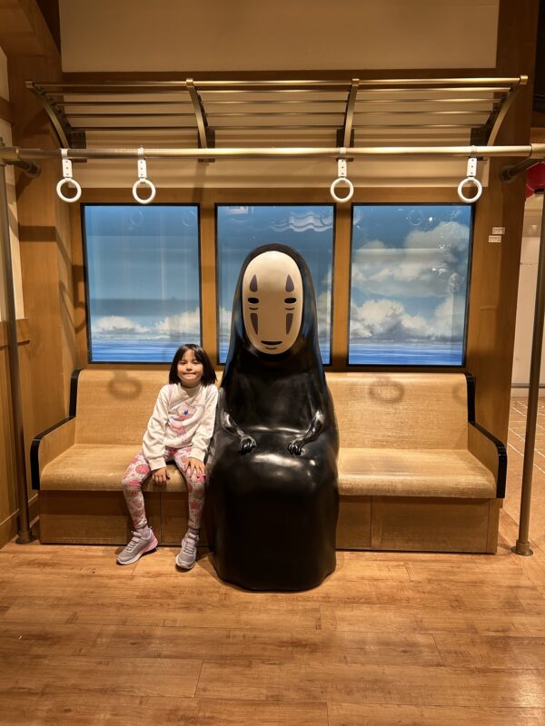 We haven’t watched Spirited Away yet, but for once there was not a 20 person line up for this photo op, so Maylin went to sit next to the ghost: