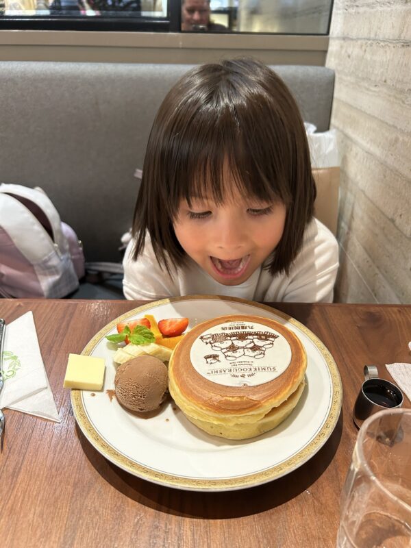 We picked a toasted egg sandwich for savoury, and Maylin wanted the cartoon character pancakes, so we split both!