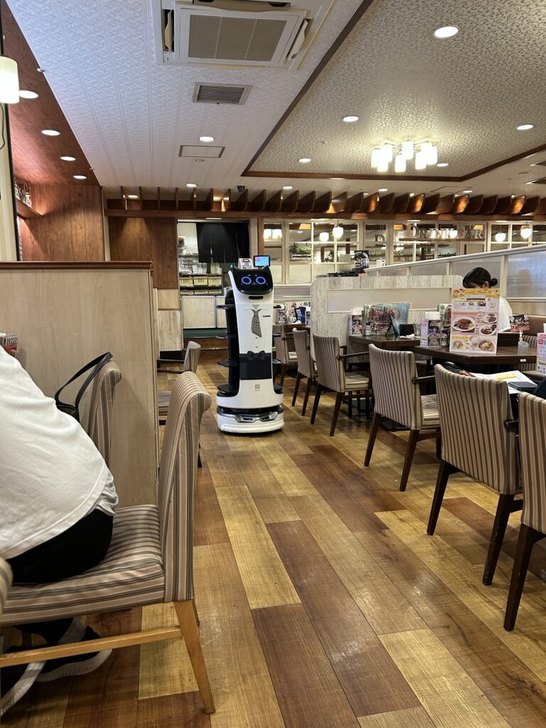 By the time we stop playing with the robot in the station, we make our way to a place for lunch. We try a couple of places, but most decent restaurant (ie: food that would entice Joe and myself) have only counter seating, which we tried for ramen dinner that one night, and it really doesn’t work well for our family. We end up finding a place called Jonathan’s, and it reminds me a lot of Denny’s, except for the servers here are also ROBOTS!