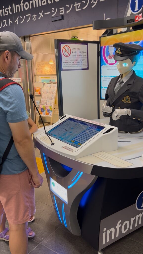 We set out for Shinjuku, hoping to get a couple of big sights in before the predicted rain this afternoon. The first thing we meet, is a robotic tourist information in the subway station. Joe decides to test it out, and attempts to have a Q&A session with The Thing.