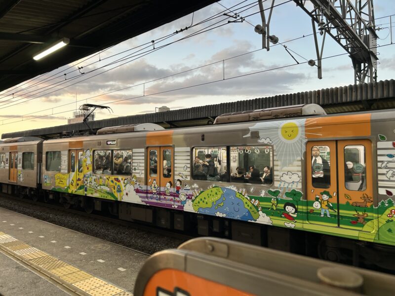 At the station, while waiting for our train, another fun one arrived at a different platform, and the girls begged me to share a picture of the interesting train: