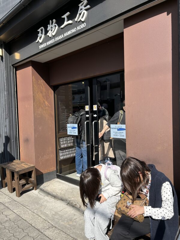 Tower Knives Osaka Hamono Kobo is a tiny, dark little shop with walls upon walls upon display cabinets of different knives, in all possible quality and price ranges. There were also lots of friendly, English-speaking staff, and so many travellers I quickly took the girls back outside. We waited patiently (well, they’re really patient when they get to play games on phones) for the looooooongest time, and then decided to go explore for a bit.