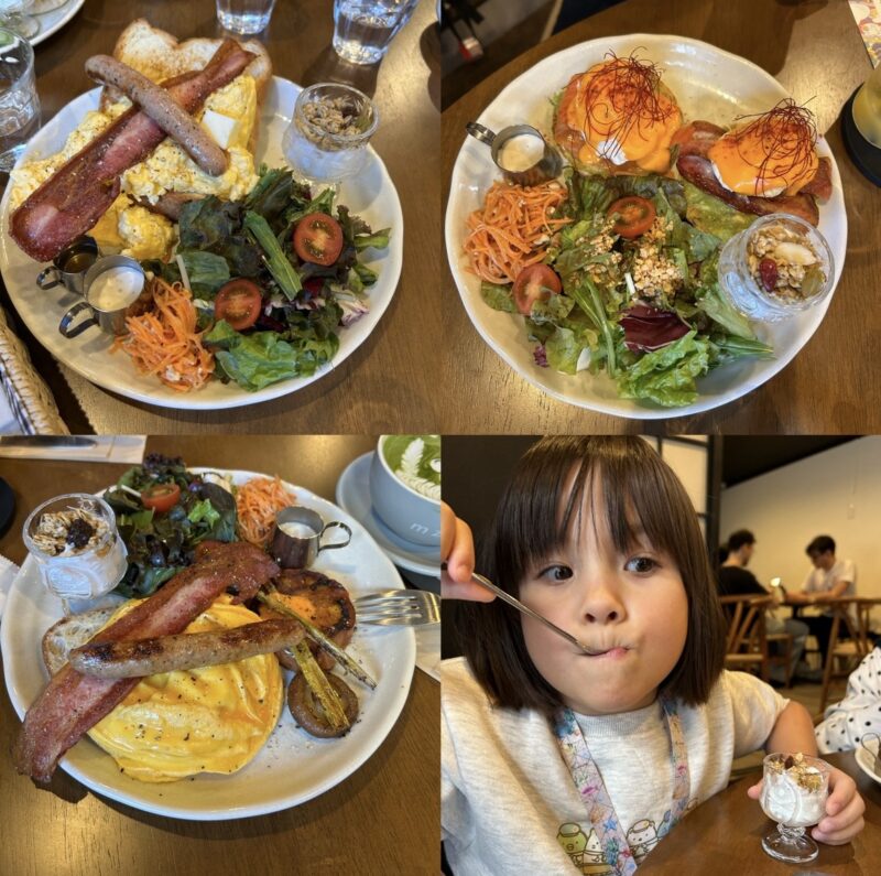 We ordered three of the café’s brunch dishes, clockwise from top left: French toast with fluffy scrambled eggs, bacon, sausage, carrot salad, green salad and granola yogurt. Eggs Benedict (one with bacon, one with smoked salmon) with carrot salad, green salad and granola yogurt. Maylin digging into the granola yogurt in the fancy stem glass with the world’s longest handled smallest spoon. Sourdough (although the menu said baguette) toast with barely set scrambled eggs, grilled vegetables, bacon, sausage, carrot salad, green salad and granola yogurt.