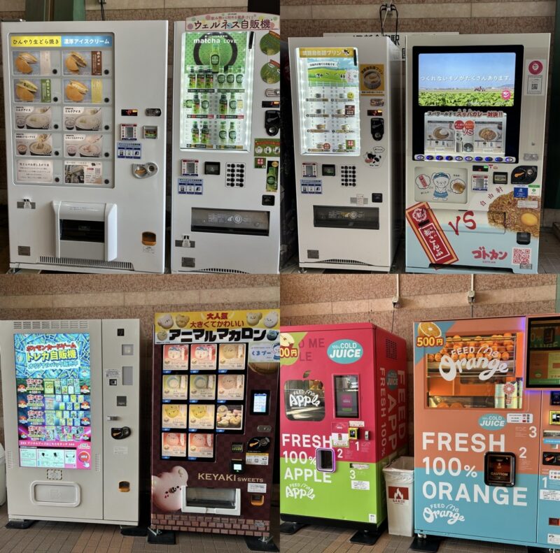 Clockwise from top left: Dorayaki and ice cream machine, matcha machine, pudding machine and pudding machine, fresh orange juice machine and fresh apple juice machine (!!!), macaron machine and Pokémon card machine.