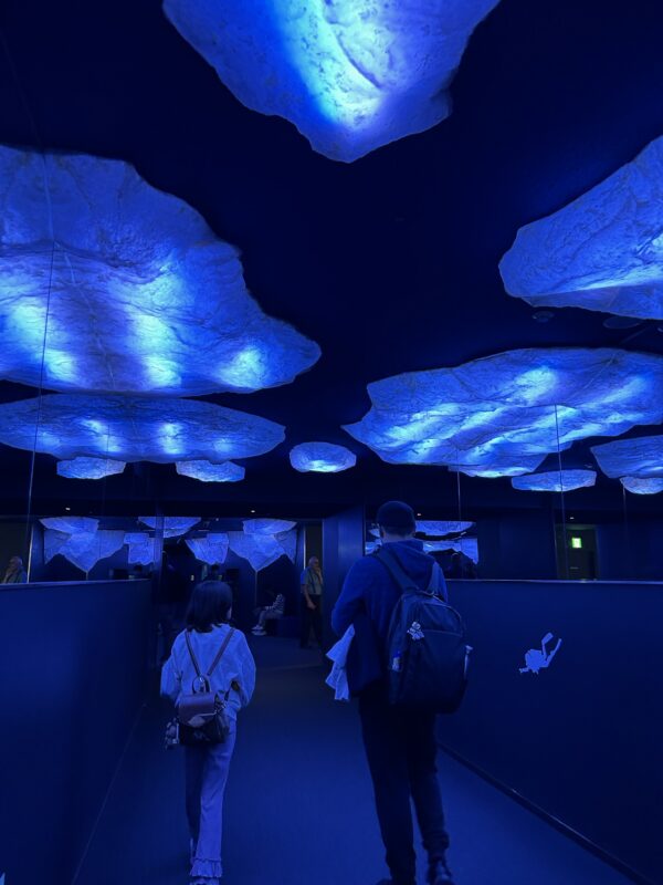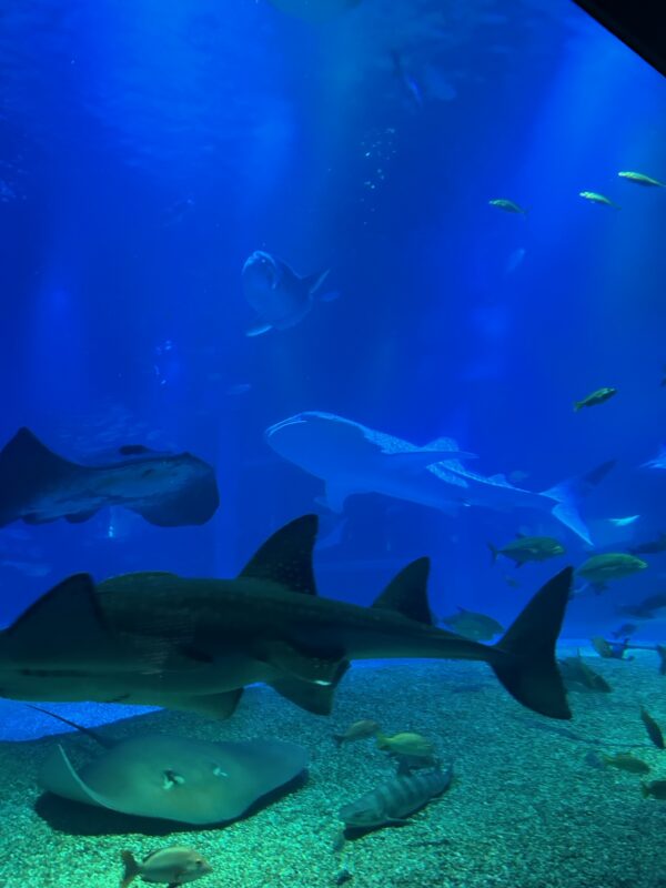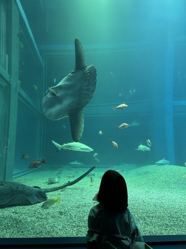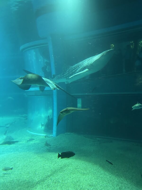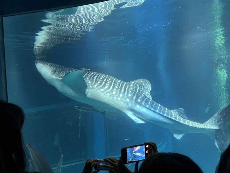 The main event at the Osaka Aquarium is the whale shark tank. This massive tank is the centre of the entire building, and our route through the aquarium is a spiral that encircles the Pacific Ocean tank. There’s a cube of acryllic glass displayed at one point, 30cm in all directions, and that is the thickness of this glass. Amazing. Incredible. This tank has my full attention. Maylin got tired of me taking pictures and filming all the beautiful creatures within, and because there are about 100 windows from where to watch, I stopped often.