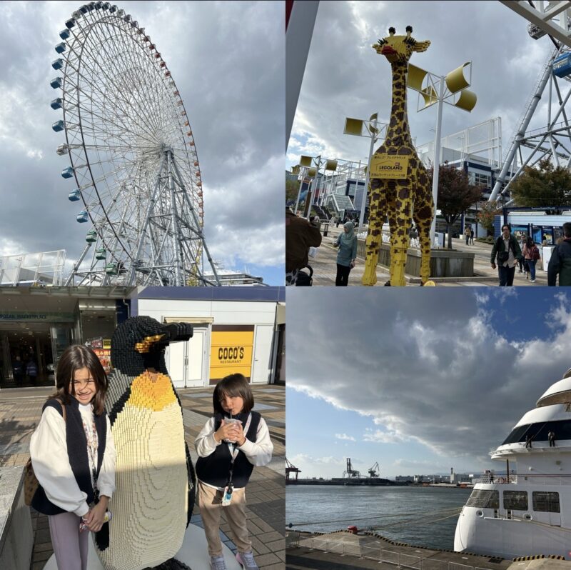 It takes us two subways and an hour total travel time from where we’re staying to the aquarium, and once we see “it”, we know we’re there! The first “it” is the enormous Ferris Wheel, the second “it” the tall Lego giraffe. Because yes of course, why wouldn’t there also be a Lego Adventureland right next door to the aquarium? This is also a cruise ship port, a sightseeing cruise port and industrial port all around, with lots and lots of visitors from all over the world.