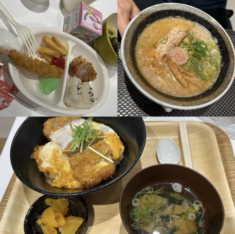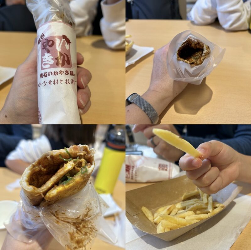 Joe finds a table in the food court, and sets off with the girls to get snack number 1. He comes back with a rolled up thingamajiggy that smells heavenly and tastes exactly like that – called a “rolled omelette” but with more substance than just eggs in the wrapping. The filling is squid and shrimp and the mayonnaise and bbq sauce we’d normally see on an okonomiyaki. So tasty! The girls had an order of butter and soy sauce french fries, while Joe and I split the omelette thing.