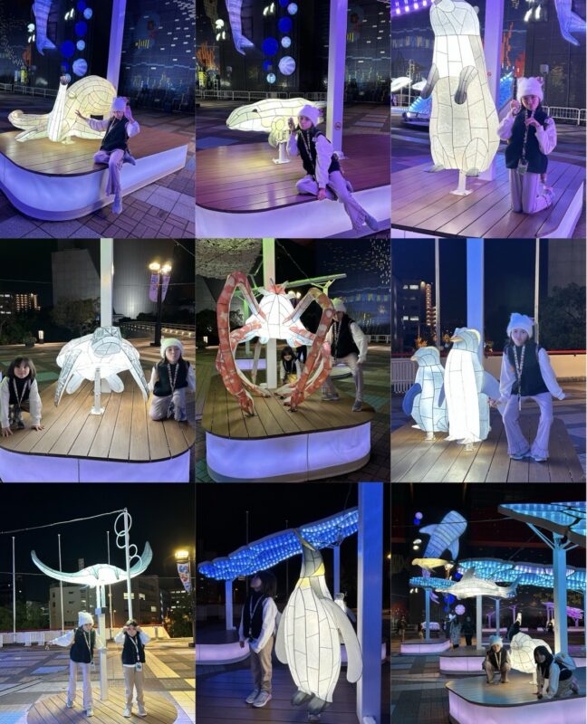 We were sad to leave the aquarium, after 3 packed and never boring hours! Outside, the buildings and creatures were now all lit up, and the girls took some time out to hang out with their new friends: