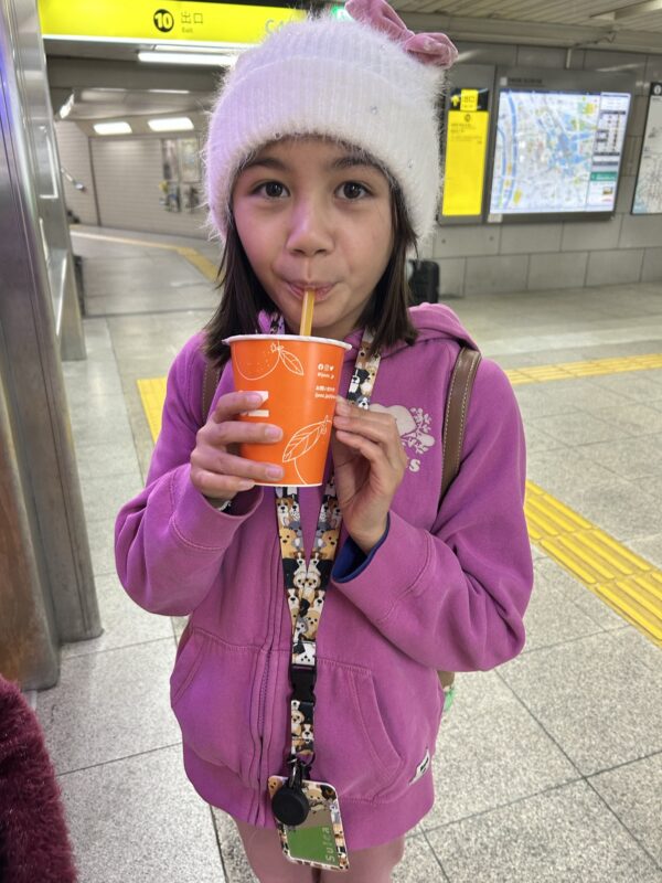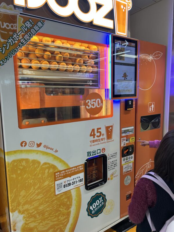 The first fun vending machine we find at the subway station today, is the IJOOZ machine I’ve been promising Téa that we’ll try one day. That day is today! She inserts her 350 in coins, and 45 seconds later, she has a cup of the very freshest, most orangy orange juice ever!