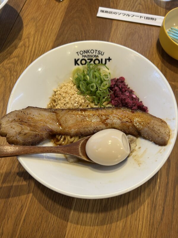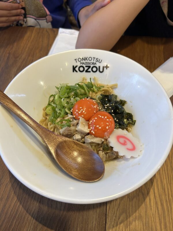 Another 10 minutes down the road, we finally make it to Tonkotsu Mazesoba Kozou+. They have counter seating visible from the entrance, but tables hidden in the way back. We placed our order at the machine at the front, and took our seats. The girls were splitting one order of noodles, and Joe and I both had the King Pork soba noodles.