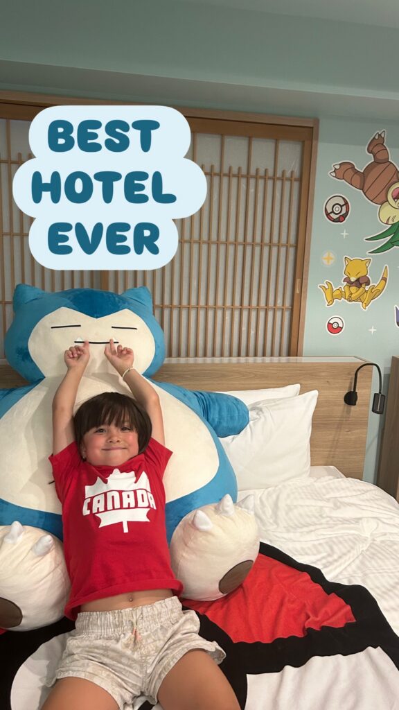At almost 3pm, I directed my troops towards the hotel, as we could now check in. We picked up the keys, and Maylin’s feet were about to fall off at this point, until… She unlocked the door and entered into a Pokémon heaven themed room! There’s an enormous Snorlax covering two of the four (!) single beds in the room, and a Pokémon table with two couches facing it, plenty of room to eat or work or just hang out. There’s a kitchenette full of Pokémon decor, Pokémon covering all the walls, even Pokémon inside the shower/bath room!