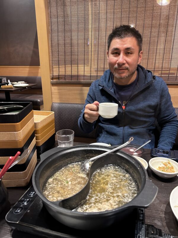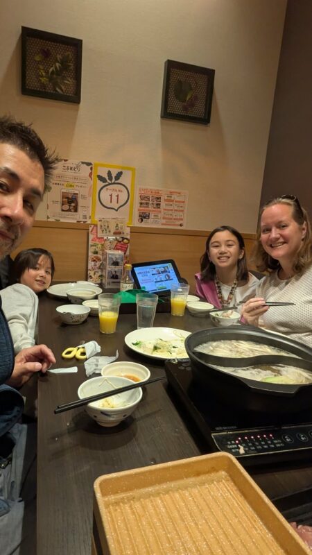 So we give the girls the option: either head back to the tempura, fried chicken, sushi place we saw, or return to the hot pot restaurant we went to once before. They unanimously vote for hot pot, now that we know how to order the meat! We arrive to a restaurant that is obviously just recovering from the lunch rush which ends at 4pm, or severely understaffed, or both. But, with a robot cat that delivers meats to your table, and a noodle, rice, curry and veggie buffet, we’re alright.