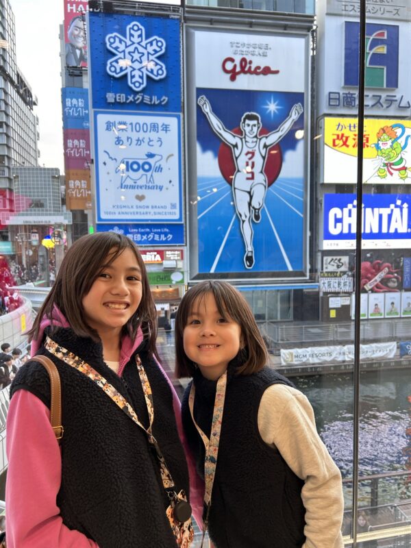 We need to go to H&M on Dotonbori, and take a different route up from Namba Walk. We walk by a restaurant that serves tempura, sushi and chicken karaage, and consider it for dinner. We find H&M, and climb to the best kept secret of all, the amazing, unobstructed, non-fighting zone view of the Glico Running Man. There’s not a soul up here taking pictures today, so the girls strike a pose with the famous backdrop.