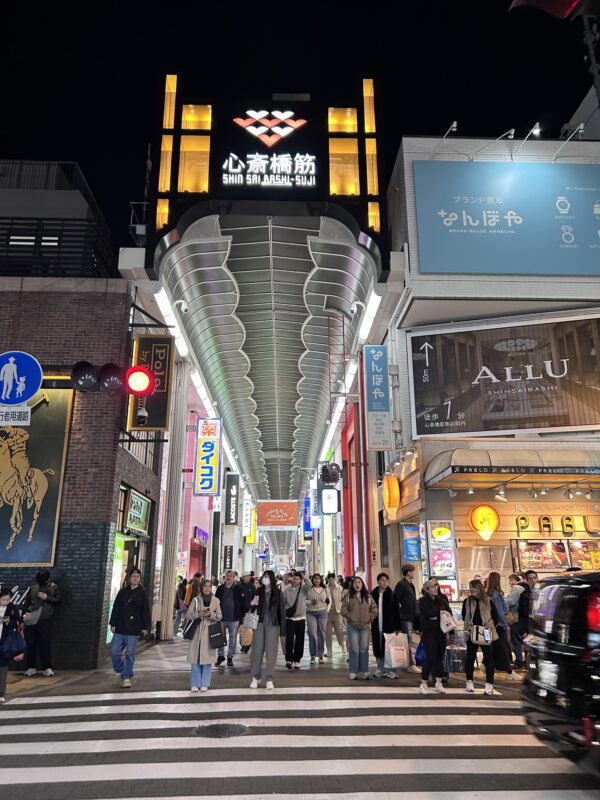 }We leave the restaurant after our 100 minutes of hotpotting are up, and get to walk through the amazing Shinsaibashi-suji back towards Namba. We have never been here this late in the evening, and I comment on how much calmer it seems today. Maybe it’s the weekday, maybe it’s the late hour? We’re usually here mid afternoon. But it looks very pretty with all the lights!