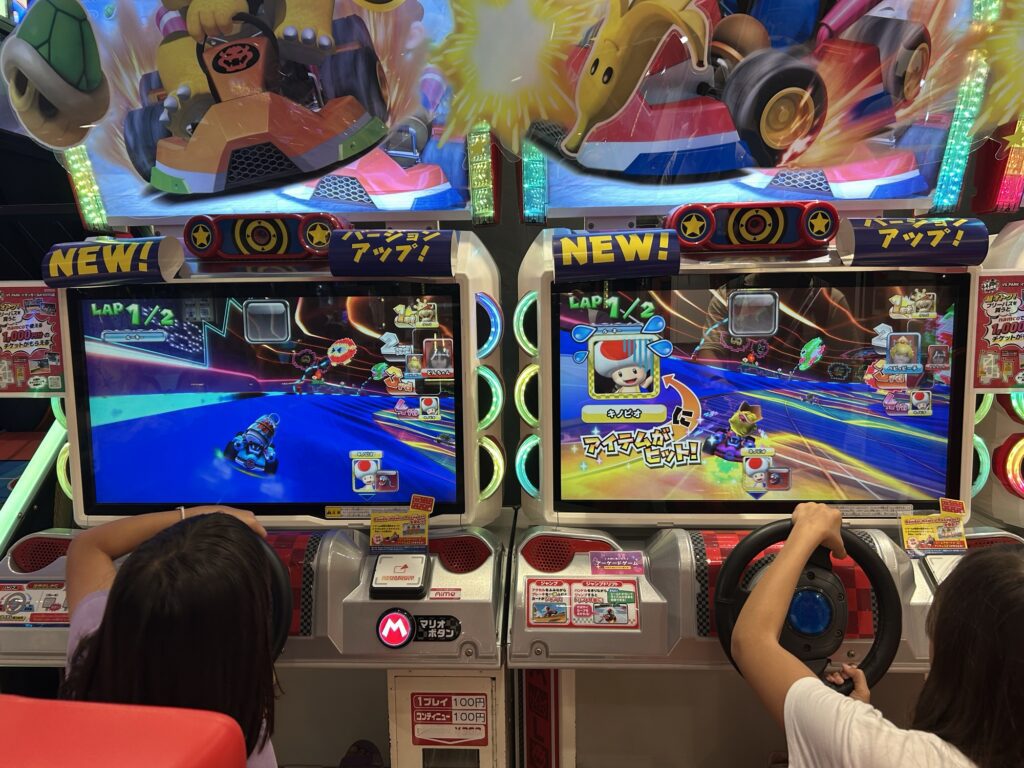 You’ll never guess what we did next… Claw machines! Gochapon! Enough to make this mom go a little bit crazy… But we steered the girls towards the video games today, Joe and I tried a drumming battle, the girls hopping in to “show us how it was done” (but not really), and they got to do a Mario Kart race.