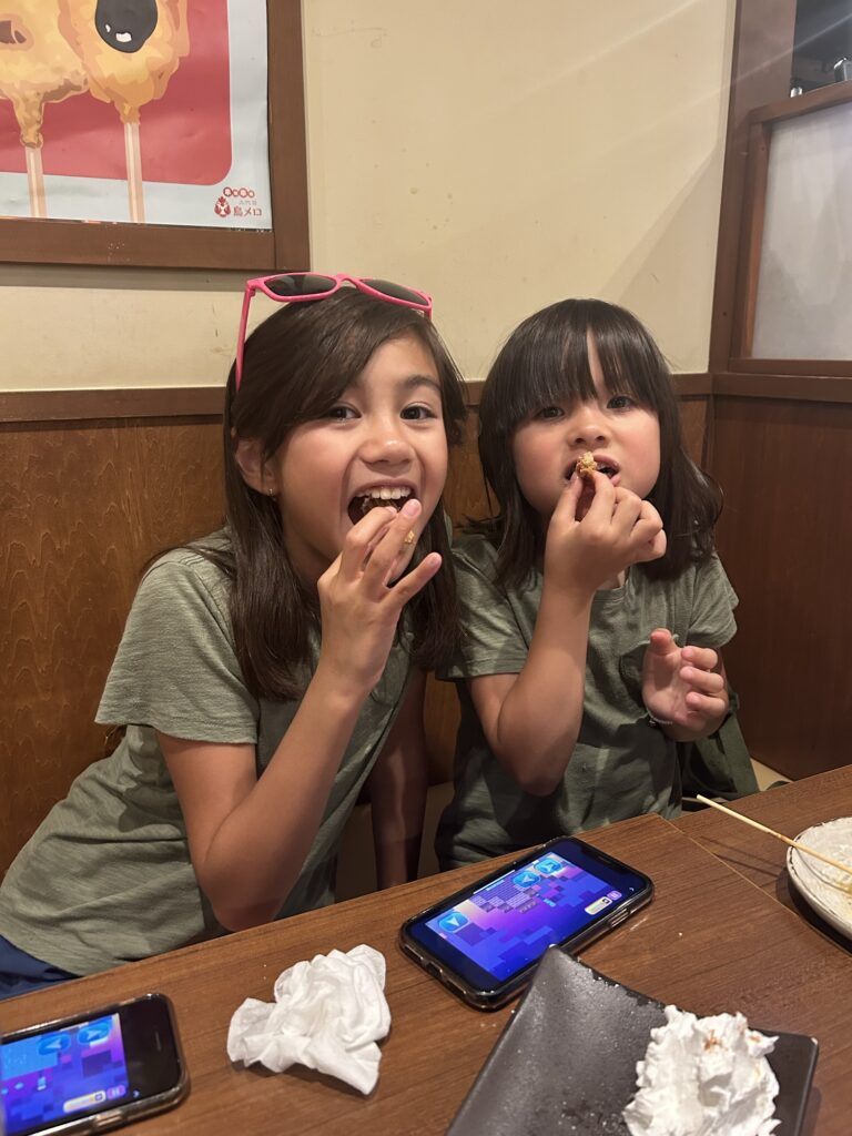 Oh what a hot day… We woke up in our Pokémon covered hotel room, and set out for breakfast. Already the 11 minute walk to Komeda coffee had us panting and wishing for air conditioning. Komeda coffee prides themselves on offering “free” breakfast with your morning coffee, so you get half a slice of fluffy toast, with either butter or strawberry jam, and you can choose between a hard boiled egg, egg salad or red bean paste as your protein. Joe and I had one of these morning sets each, and the girls picked “pizza toast with lots of eggs” (Téa) and “homemade egg dog” (Maylin). Both girls were stuffed before finishing half of their breakfasts, so mommy and daddy got leftovers to fill us up from our “large” half slice of toast breakfast…