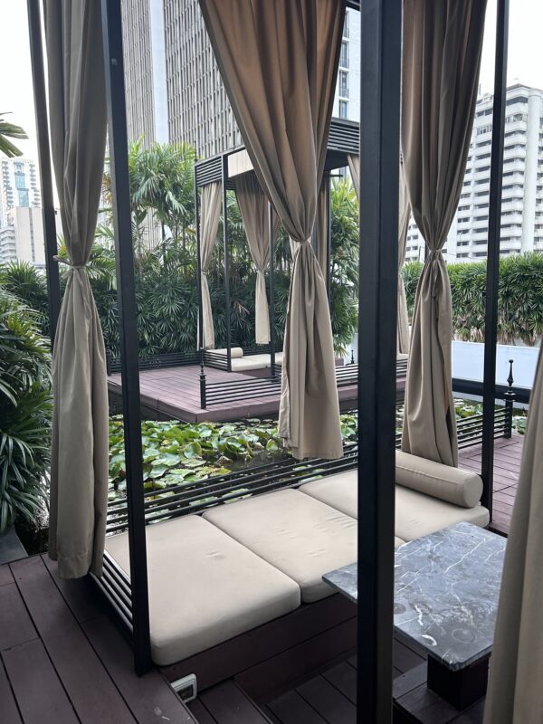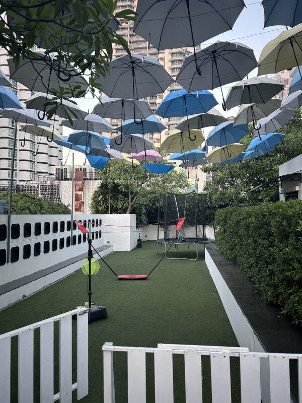 It’s our third morning in Bangkok, and Maylin and I are AWAKE while Joe and Téa are not. We decide to go up to the roof top, because we know there’s a game area there that we haven’t checked out yet. The first thing we find, is a soccer/trampoline/tetherball area, all covered in umbrellas!