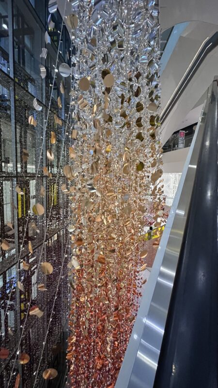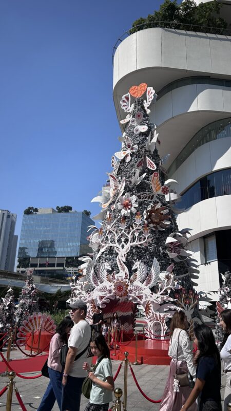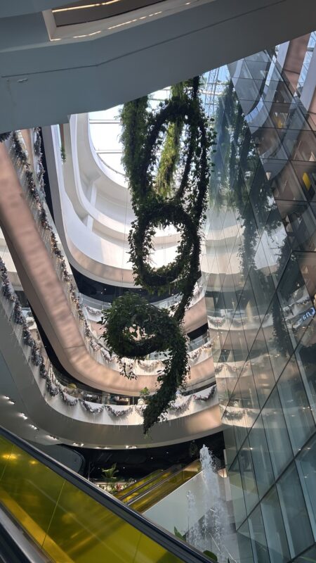 This is a very confusing mall. It’s as if there are two buildings, kind of glued together behind a waterfall to make it one building, but it’s not very cohesive, and it’s definitely not “user friendly”. Suddenly we’re at an exit, and we see Christmas decor outside, so of course we have to go check it out!