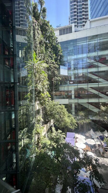 We see a road, and walk towards it. Where there are cars, there must be freedom! Right? Wrong. We’re fenced in. No gate, no exit. I contemplate climbing over the fence, but don’t say it out loud. Instead, we look at the map for the umpteenth time (no wonder we recharge our phones daily when out and about, thank you battery bank) and locate a corner that looks promising. We finally find a gate, wide open, and escape the park where the wild things live. The Grab taxi picks us up, and 20 minutes later, we arrive at EmQuartier, another “must see” mall on Joe’s list of air conditioned spaces to explore Thai culture in comfort.