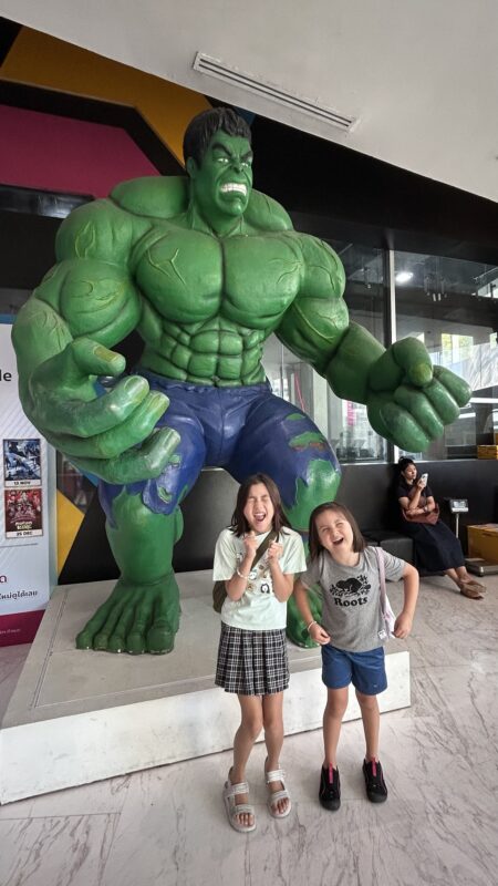 This mall, just like at our “home” mall Terminal 21, there’s an entire entertainment floor. This one has a trampoline park and a movie theatre. But first, we have to take a picture with our good friend The Hulk: