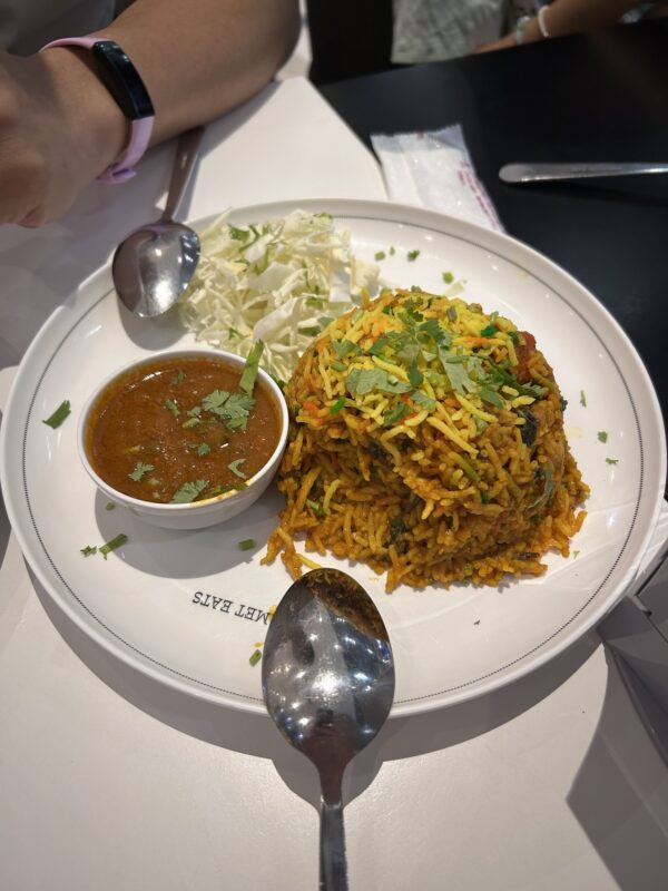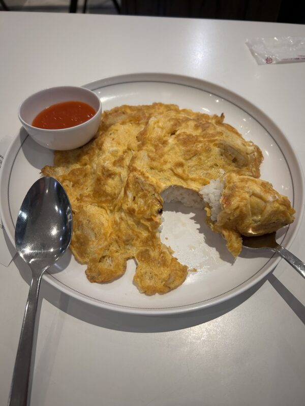 We go aaaaaaalllllll the way back down to the market area in the basement for our second lunch/snack of the day. This time Joe shops and I sit. He comes back with a delicious crab egg over rice (albeit very crunchy, I don’t believe shell is meant to be part of the recipe) and a tasty chicken briyani dish. Beware of the spicy dipping sauces! Our bellies are full, our mouths are on fire, and the little pile of crab shell has grown.