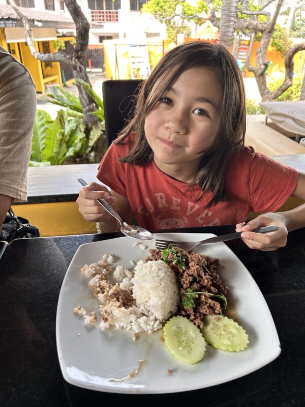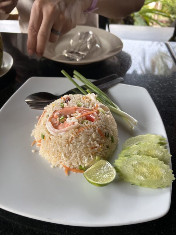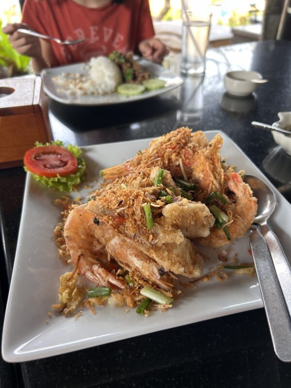 It was warm, and it was lunchtime. We picked one of the nearby restaurants (not the one we’d literally have to cross the ocean to get to), it was so beautiful! It was open air, but covered, so no walls, just tables and a roof, which meant the breeze and views were both beautiful and much appreciated. The girls ordered a beef and Thai basil dish to share, non spicy, and Joe and I ordered a seafood fried rice, non-spicy in case the girls needed more food, and a fried shrimp with chili and salt – spicy.