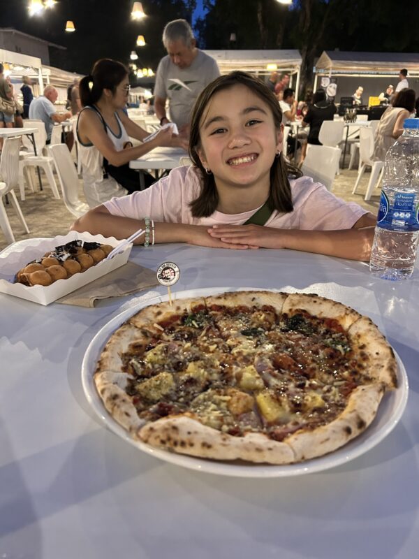 The girls and I have a great dinner at the Cicada market! At this market, you prepurchase tokens at a booth, 100THB per set of tokens, and at the end of the night, anything you have left over, you bring back for a refund. The vendors do not accept cash, only tokens. First, we get 3 sets of tokens, but after having spent some on the coconut pancakes, we need to buy more to afford the pizza we just discovered. One of the vendors has a full on wood fired pizza oven at their stall, and their pizzas cost 360 in tokens (equivalent to 360THB or $15.63CA). We get more tokens, buy a half an half cheese and hawaiian pizza, and then Téa spends the rest on a bubble waffle, which Maylin adds crushed Oreo cookies to.