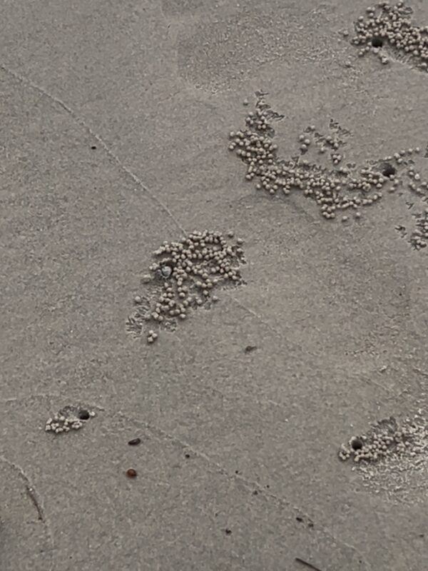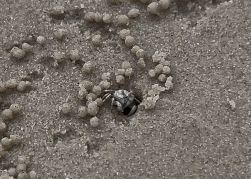 We found little holes in the sand, with what looked like teeny tiny sand snowballs surrounding them, and stood completely still until the microscopic white crabs came out and spat out more sandballs.