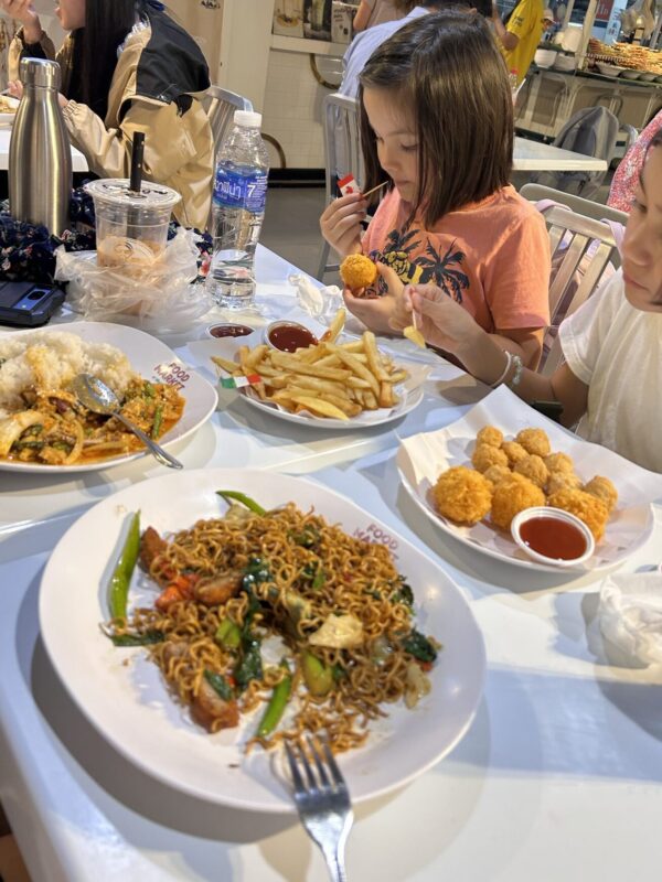 Today, we dine in the prepaid cash card section, because we have wallets with us, so we can! Joe guards our table and tells me he wants “something with rice”. I head to a seafood stall and buy him something seafoody over rice. We get a buzzer for when it’s ready, and head to buy the girls something. Téa takes me outside of the prepaid area and shows me what she wants, cheese balls, chicken pop balls and French fries. I order, pay and am told to come back in 10 minutes. That gives me just enough time to browse and decide on a pan fried noodle with beef for myself. “How spicy do you want it” the lady asks, and take it from me. Never say more than mild! I said mild to medium. I was about to learn NEVER to say that again…