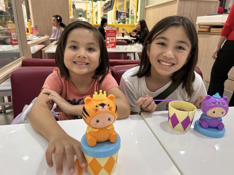 After a very stressful non-shopping shopping trip, I am ready for a snack, and the girls and I head to Swenson’s, an ice cream chain we’ve been seeing in all the malls, but not yet tried. Joe has a couple of things to pick up at the grocery store he compared to a Walmart, so the girls and I get seated and place our orders. The girls care more for cute plastic toys than actual ice cream, so they order a scoop of ice cream in a toy novelty cup each.