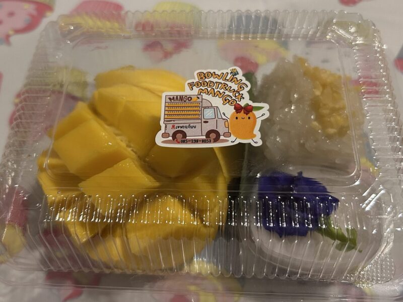 Once dinner is literally in the bag, he heads up the road to the Bowling Mango store for some mango sticky rice. We really do love the mango sticky rice vendor at the market, and are having trouble finding anywhere else that compares. Bowling Mango served up an entire mango, which is generous, but their rice portion was abysmal. Maybe 1/4 cup? Lots of sauce. 1/4 of sticky rice does not really stand up to an entire mango in a dish that we’ve gotten used to more of a 50/50 ratio. But the mango is ripe and delicious, and they have the cruncy grains on top of the rice, with the market vendor does not. I think it would be very hard to screw up mango sticky rice, and I know I’m just nit-picking…