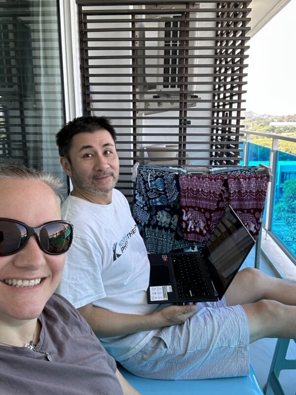 My feet are itching for new adventures, so today we’re exploring a different beach! But first – school work! The girls are doing English today, and once they are set up, Joe and I head out to our balcony office:
