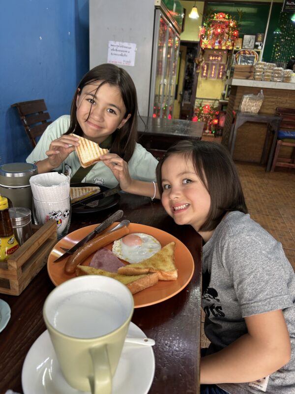 It’s Friday, and languages are on the schedule. Téa starts with French on the balcony with Joe, while Maylin and I work on Norwegian at the table inside. Once Maylin’s Norwegian is done, the girls switch. There’s also Duolingo to be done on the phones, which is the most fun task of all on language day. It feels like a game, after all!