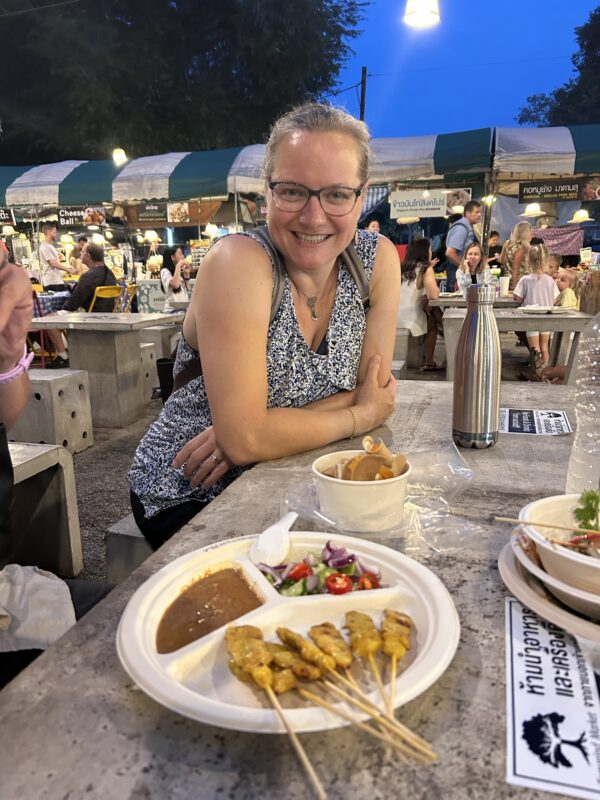 At one point we contemplate meeting Joe and Maylin at Tamarind for dinner, but then we also have groceries in our shopping bag, so we decide to go home first, then walk over to the market together. (Also, we’re a teeny bit sad that we didn’t get to go swimming today, our second day in Thailand with no swimming!)
