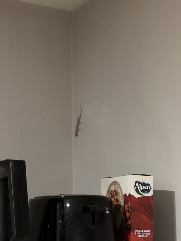 Joe wants the gecko out. He tasks me (I’m not afraid!) with capturing the gecko and releasing it outside, but as soon as I come at it with the container, he runs off, straight down the wall. We assume that, if he hasn’t already escaped the same way he entered, he’s still back there, somewhere behind the refrigerator…
