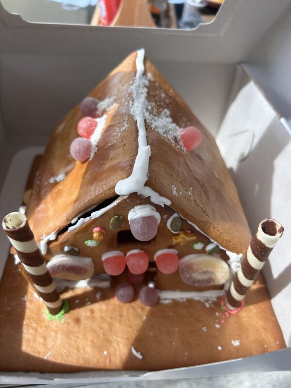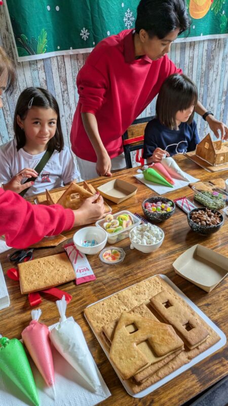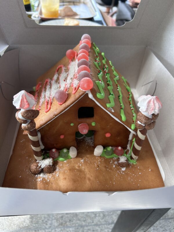 We are almost first to arrive, and ask if they received our booking. They hurriedly count their supplies, and decide that the girls can stay, and they each get a gingerbread house to decorate. There are supplies, decorations, icing “glue” and helpers galore! The event was supposed to be an 11.30am to 2.30pm gingerbread house workshop, so Joe and I settle in outside and order two juices and a sandwich.
