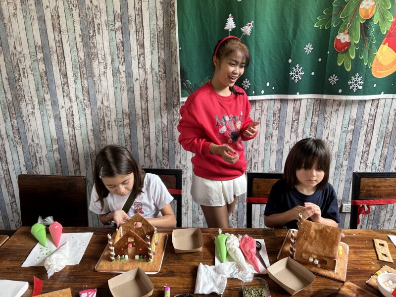Both girls are now done, their creations boxed up and it’s only just 12.45pm. We are in the middle of nowhere, and home sounds pretty sweet right now, Joe and I have been warm the entire time, as there was no room for all the parents to be in the air conditioning, the entire café is now a gingerbread workshop. Joe goes in to pay and enquire about Maylin’s sandwich. It has not yet been started, so we politely cancel our sandwich order, buy the girls an ice cream cone each instead from the freezer near the cash register (instantly ready to eat). But hurry! Our Grab taxi is arriving in 8 minutes! I’ve never seen the girls finish their ice creams quite this fast, and we carefully carry two beautiful gingerbread houses to the parking lot.