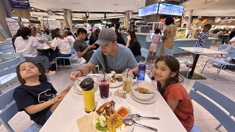 Bluport outside is packed. There are important looking people on stage and an entire audience watching them when we arrive, and we hurry past to go eat first. Food court today, Téa picks a pork noodle soup, and Maylin wants what Téa has. Joe gets a chicken curry over rice, and I end up with fried chicken and briyani. All in total, dinner and drinks for the family, 310THB or $13.55CA.