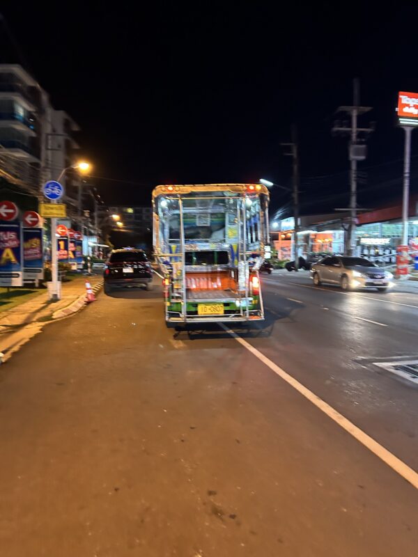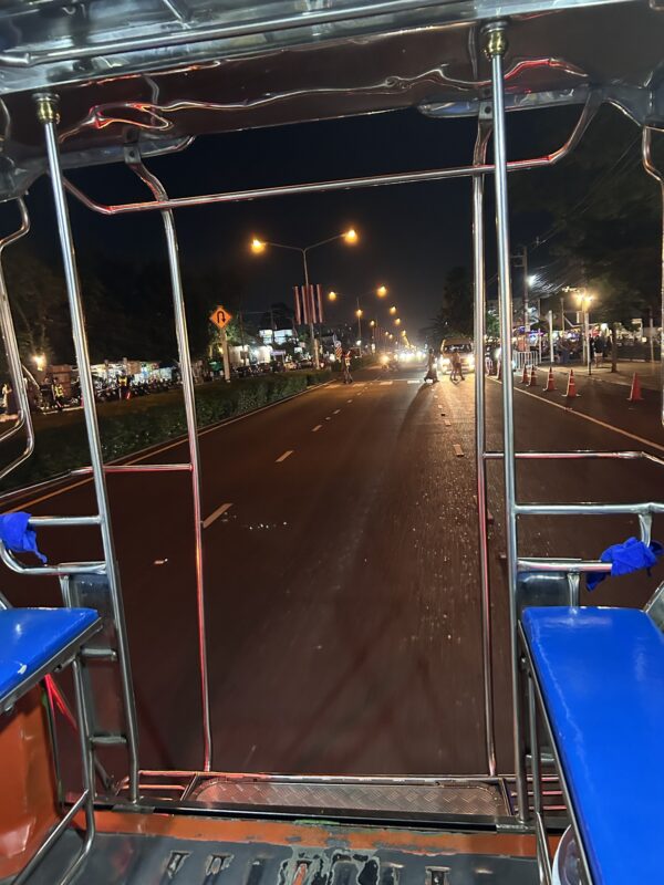 We cross the street and stick our hand out when the tuktuk bus arrives. It is a busy night, and packed. Téa and Maylin usually always get seats, as kids need to be protected at all times in Thailand, it’s just the norm when dealing with locals. We’re dealing with a bus full of tourists, so no seats are provided, but one man kindly makes sure both girls are given sufficient space and a spot on the pole to hang on. Joe and I both stand on the little step inches above the road, holding on and facing the girls. My dress balloons, and I’m glad it’s a long one.