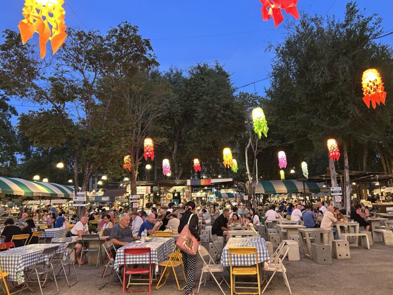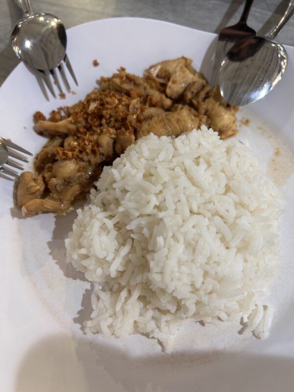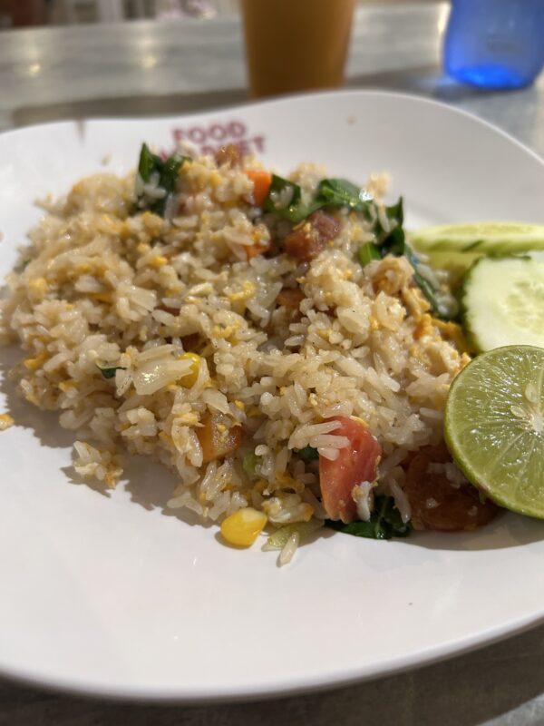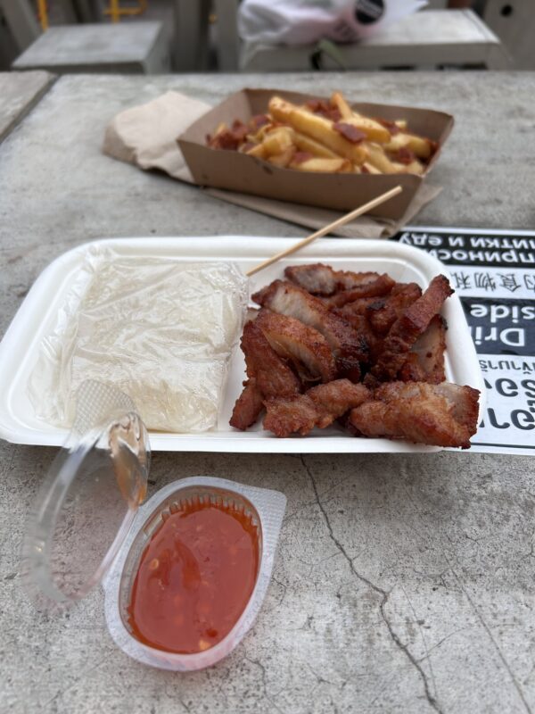 By the time I make it back to the table with Téa, Joe is off buying us some food. I had been curious to try the dry fried pork with sticky rice, and it’s waiting for me at the table. It was a disappointment, but now I know! Then Joe returns with a spicy and saucy curry that was a little too fiery. We can’t just sail through life loving allllll the dishes either! Maylin loved her hot dog from the same vendor as last time, and Téa had French Fries with a bacon topping.