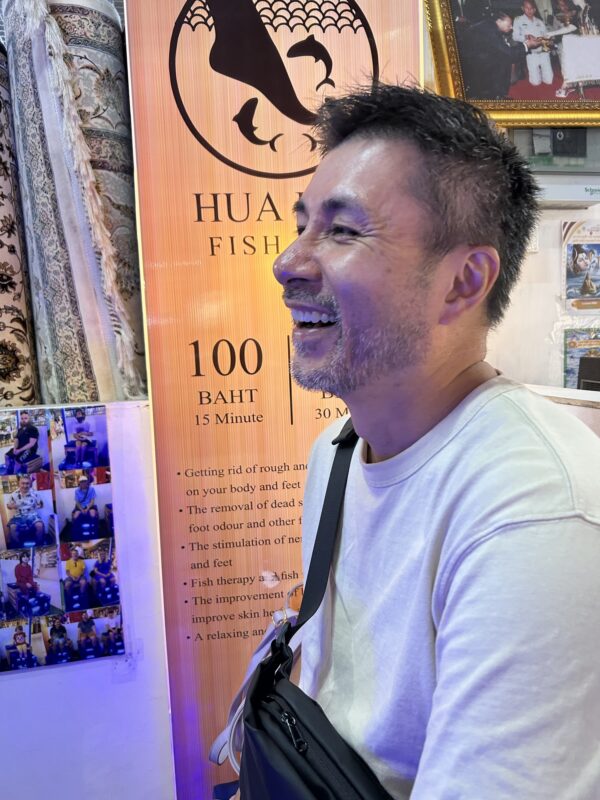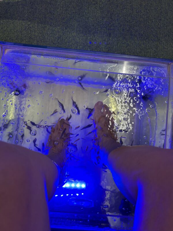 After a delicious market lunch, Joe suggested we go check out a place we’ve been curiously staring at every time we walk by… It’s a fish foot spa!! Maylin, Joe and I eagerly hop on and after a quick rub down of our feet with a wet cloth (lotions and bug sprays are not good for fish, apparently), we stick our feet into aquariums to become fish food for a bit!