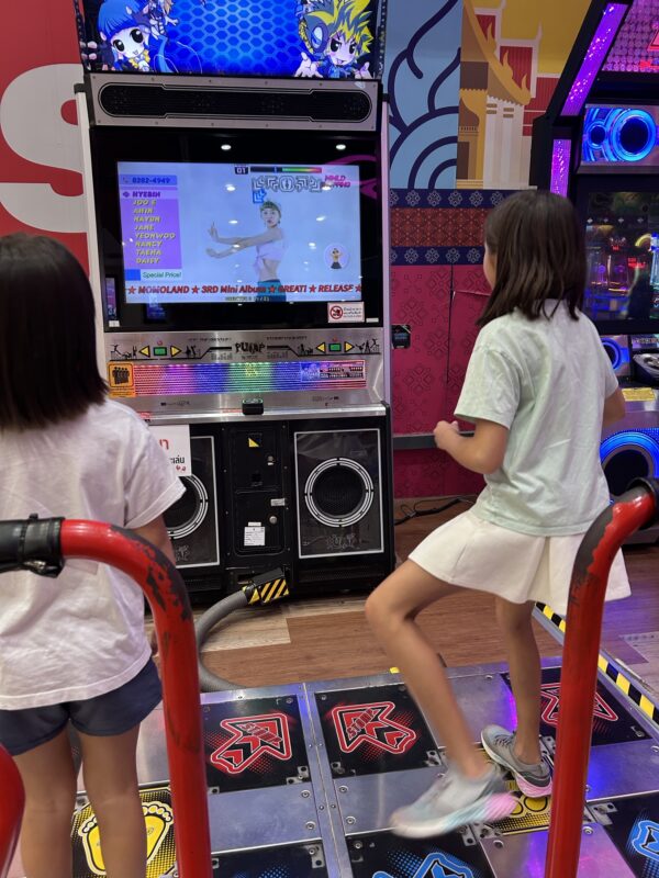 After my pedicure, I locate my family on the top floor, back in the entertainment zone. The girls play air hockey and dance games, and then Téa rolls a ball to earn 200 tickets towards a prize! Once loaded up onto the game card, we’re done playing and heading for a snack.