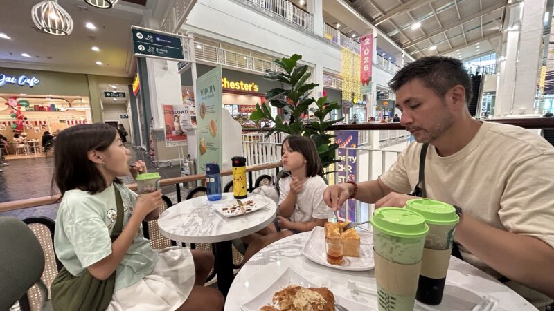 We found a little vendor selling milk teas and pastries, and had a snack. Téa had a chocolate croissant and a chocolate milk, Joe had French Toast and iced coffee, I had an almond croissant and an iced green tea (read: not matcha) latte, and Maylin chose to share whatever everyone else was having.